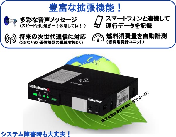 | データ・テック社の商用車向けテレマティクス端末セイフティレコーダ (デジタルタコグラフ+ドライブレコーダー)です。 独立型とクラウド型が選べます。 |
